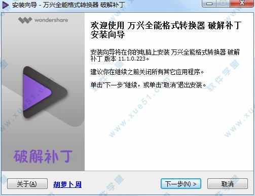 1、在文件包中找到“万兴全能格式转换器 破解补丁11.1.0.223.exe”这个破解补丁,并双击启动开始安装打开后点击“下一步”。