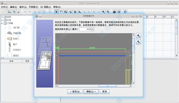 2)选择背景图之后,你可以设置背景图的比例尺,这样可以使你画的图形符合真实大小。该软件比例尺的设置通过在图上选中已知距离的两点,然后在上面输入两点间真正的长度来确定。我使用的背景图是CAD图纸输出的bmp图片,在图中有标注线,所以我选择标注出来距离的两点作为参考。
