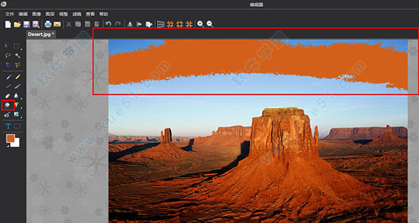 2、然后可以看到工具栏中的颜色也就变成了吸管工具选中的颜色,然后选择油漆桶工具,在图片内使用一下,可以看到效果。