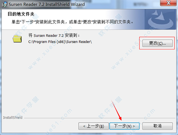 3、自定义软件安装目录,默认路径为“C:\Program Files (x86)\Sursen Reader\”,安装路径选择时不要带有英文符号的路径,点击“下一步”进行安装;
