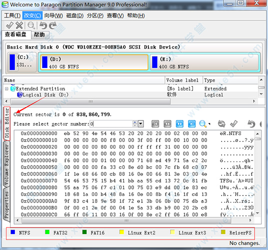 4、在软件界面右下角的功能分栏中选择“Disk Editor”磁盘编辑,我们可以看到磁盘编码的序号以及磁盘读取的格式,包括NFTS、FAT32、FAT16、LINUX EXT2等;