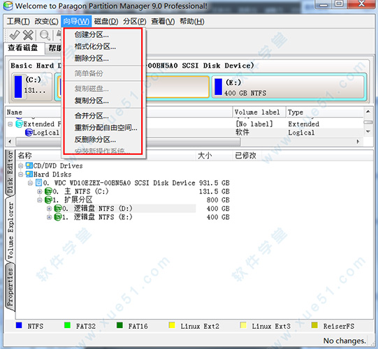 6、同时在“向导”中,我们可以进行磁盘管理的创建、删除、复制、合并以及格式化操作。