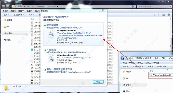 2、最后将Crack文件夹下的“WsAppFoundation.dll”破解补丁复制到上一步中打开的软件位置,在出现的提示中选择复制和替换这一项即可完成破解。