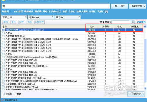 6、对于里面搜索后的功能应用,可以点击如图所示地区对资源的大小,资源数,格式,下载速度进行帅选,根究个人需要而定。
