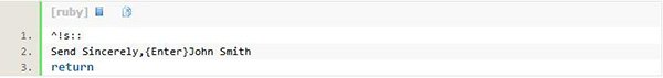 最后,按键序列还可以用于定义字符串的缩写,即热字符串 。例如,下例将 btw 定义为 by the way 的缩写,无论何时你输入 btw 后再输入空格或逗号,都会被替换成 "by the way":