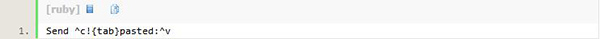代码会依次发送 Control+C、Alt+Tab、字符串 "pasted:"和 Control+V。完整的特殊字符列表请参阅 Send 命令。