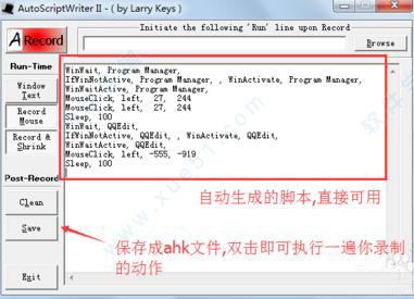我提供的绿色版里有一个AutoScriptWriter软件,是用来记录电脑操作,自动生成脚本的,使用方法:双击AutoScriptWriter.exe,如下图: