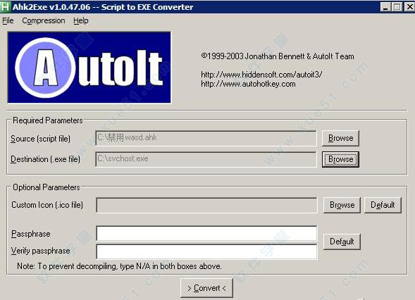3、接下来切换到Ahk2Exe程序窗口,点击“Source”后面的“Browse”按钮,选择“禁用ASDF.ahk”。再点击“Destination”后面的“Browse”按钮,选择可执行脚本文件的保存位置以及文件名。比如我为了使脚本更具迷惑性,故意将生成的exe文件命名为Svchost.exe(图1)。点击最下方的“Convert”按钮便可生成可执行脚本文件了