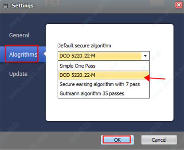 2、点击“Alogrithms”选项卡,在“Default secure algonithm”下载框中选择清除算法。