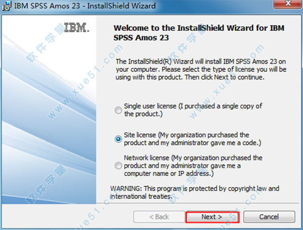 2、然后双击运行SPSSA_23.exe程序进行软件安装,弹出界面,进入安装向导界面,选择Site license第二项,然后点击next继续安装