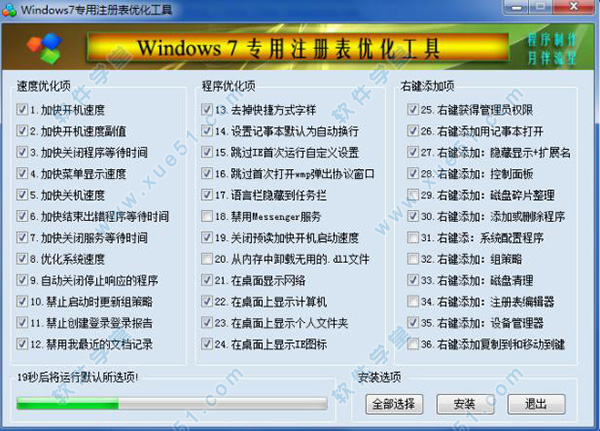 2、打开软件,选择需要的功能,以注册表优化为例:打开功能选项,选择需要优化的项目(速度优化项、程序优化项、右键添加项)等,然后点击安装即可。