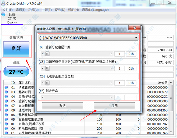4、点击主界面左侧的“健康状态”图标可以进行健康状态的设置,对警告的临界值进行合理的分配,设置完成后点击“应用”即可;