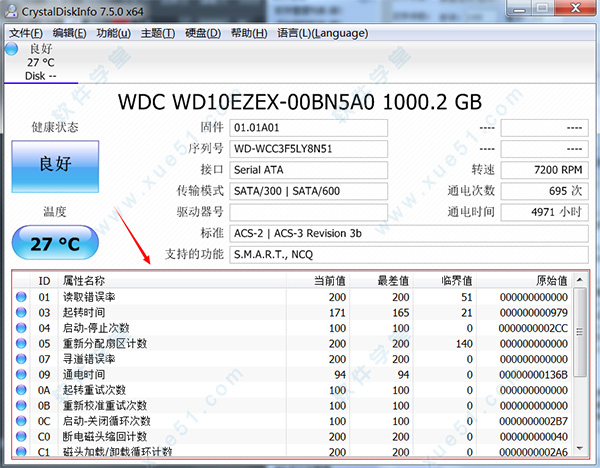3、其次在软件的下方可以观看到硬盘的各项分析数据,在显示出的当前值、临界值、最差值以及原始值的基础上进行硬盘健康状况的粗略性分析;