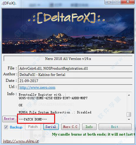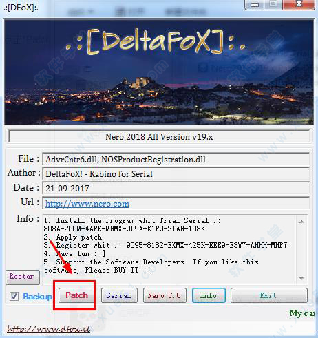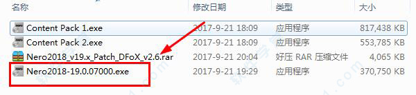 7、回到之前解压后的文件夹中,解压里面的“Nero2018_v19.x_Patch_DFoX_v2.6.rar”压缩包,然后双击运行里面的“Nero2018_v19.x_Patch_DFoX_v2.6.exe”,点击“Patch”。