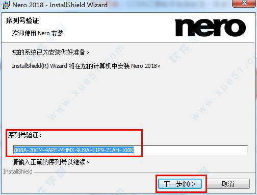 3、序列号验证,软件会有默认自建的序列号,我们无需修改,直接点击“下一步”。