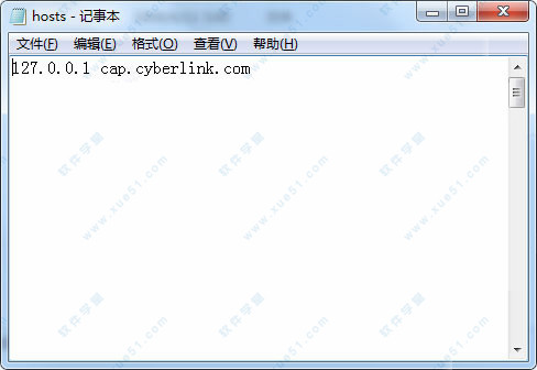 8、在其中添加“127.0.0.1 cap.cyberlink.com”屏蔽联网(注意:一定要记得保存,如果保存不了右键点击文件取消“只读”后进行修改)
