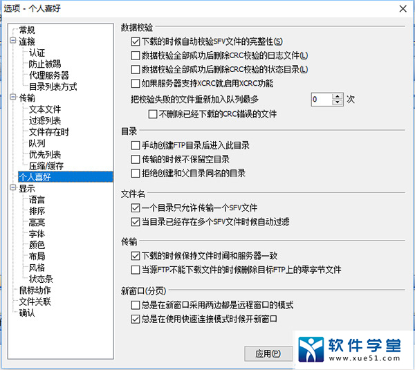 7、由于软件在下载文件之前会首先建立一些以下载文件名命名,并加上后缀“.missing”的文件。有时候下载可能会中断或者被我们手动停止,这样一来硬盘中就残留了很多无用的文件,如何避免这样情况的发生呢?只需在程序中选择“工具→选项”按钮打开软件设置窗口,切换到“个人喜好”标签,取消勾选“下载的时候自动校验SFV文件的完整性”一项即可,如下图所示: