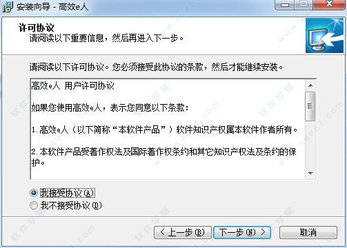 3、来到用户许可协议界面,选择“我接受协议”这一项,然后点击“下一步”。