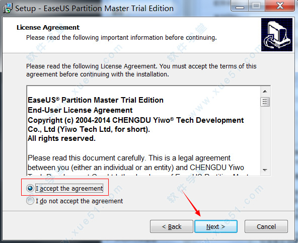 2、选择“I accept the agreement”同意软件许可证协议,协议内容自行决定是否浏览,点击“Next”开始安装;