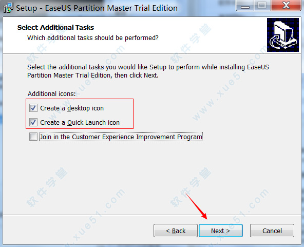 4、勾选创建快捷方式和桌面图标,不加入用户提升体验,默认选择即可,点击“Next”继续安装;