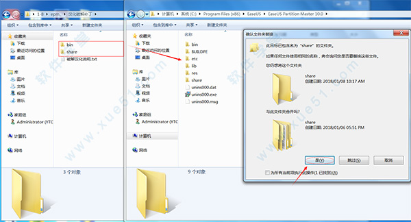 2、复制文件夹目录下的“bin”和“share”文件夹到软件的安装目录下,在弹出的提示窗口中选择“是”按钮;