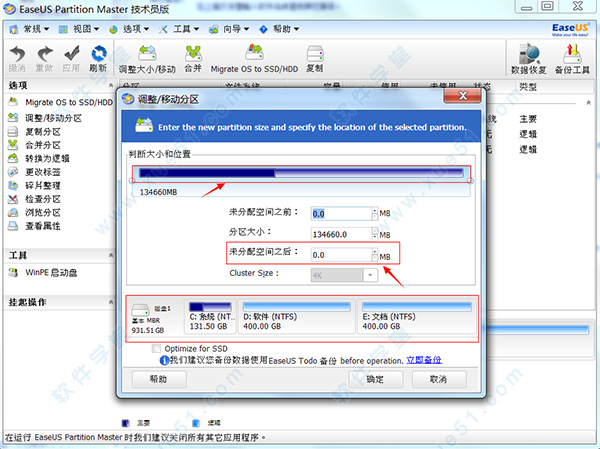 5、可以调整分区大小和移动分区。这个功能大家只要选择分区后,点击“resize/move”后就可以使用,并且调整界面和PartitionMagic一样,你可以使用鼠标来轻松调整大小。