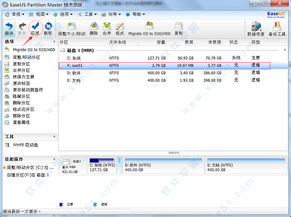 5、设置完成后点击“应用”按钮即可完成分区设置;
