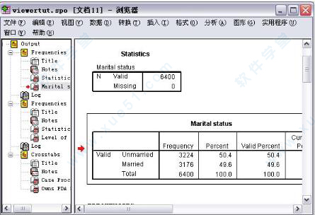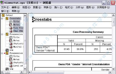二、数据分析 对于外行人来说。该软件最为难学的部分便是它Analyze菜单下十多项子菜单以及这之下四五十项孙菜单的统计功能,每一项统计功能的用法和功能对于外行人来说就像是天书一般。但是对于学习过统计学的读者来说,这应该不是问题。再加上它在操作的简易性上还是十分优秀的,每一项统计功能一般只需要在窗口下选择统计用的变量,然后设置一下必要的选项,最后按下OK便可以了。所以在这里,具体的操作就不再介绍了。在这里,笔者觉得有必要先介绍一下软件的Viewer。在下面的数据分析和数据输出过程中,我们调用它的数据分析和制图模块所得到的结果都会由这款软件自动输出到一个名为Viewer的程序中,并且可以以SPO为后缀名保存成为专门的文件。这样做的好处是如果你的分析和制图工作一次没有完成,那么利用保存的SPO文件,就不必下一次重新作过了。同时,将所有的分析和制图的结果都保存在一个SPO文件中,并随调查报告作为电子附件一起陈送给客户,一来有利于客户检验分析的可靠性,二来也适合于今后电子化、网络化的趋势。