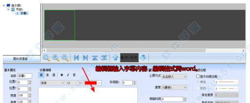 5、这里举例使用最基本的字幕功能,我们点击字幕,开启字幕编辑框。在字幕编辑框中输入字幕内容,然后编辑格式。格式的设置同word文档格式设置。这里需要注意的是可以控制字幕的行走速度和方式。当然这也是要又控制卡决定的。