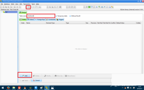2、然后左边就会出现刚才创建好的数据库,选择菜单栏中的新增表按钮,然后输入名字,点击下方add添加字段