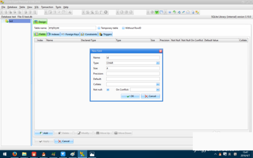 3、在弹出的对话框中设置字段名(Name),字段类型(Type),字段长度(Size),是否可空(not null),然后点击OK