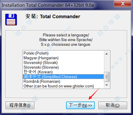 1、在本站下载好Total Commander软件压缩包,将文件解压,双击运行“tcmd900ax32_64.exe”程序,弹出语言选择框,选择“简体中文”,点击“下一步”开始安装;