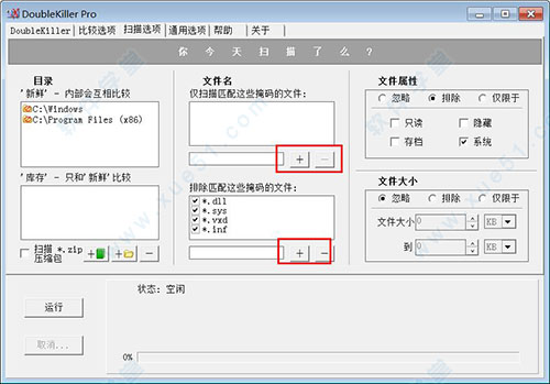 4、在“文件属性”、“文件大小”中可忽略搜索特定属性的文件,比如默认选中的“System”就是系统文件,这样可以保护重要的系统文件。