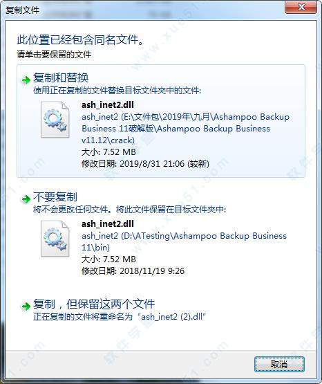 5、将crack文件包里面的“ash_inet2.dll”破解补丁复制到安装路径下选择替换原文件即可完成破解,默认路径为:【C:\Program Files\Ashampoo\Ashampoo Backup Business 11\bin】。