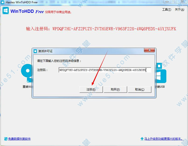 5、接着运行软件,在关于中找到激活选项,输入注册码:【WPDQF7HU-AFZ2PUZY-ZVTH5EWR-V963F228-4WQ8PEDX-45YJXUFK】,然后点击“注册”按钮。