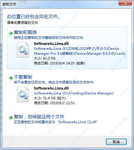 10、最后将Crack文件夹下的“Software4u.Lima.dll”破解补丁复制到上一步中打开的软件位置,在出现的提示中选择复制和替换这一项即可完成破解。