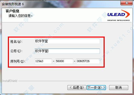 4、填入注册信息,姓名和公司可以随意填,序列号:129A3-56000-00605726填入