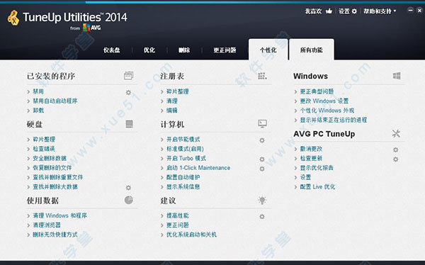 tuneup utilities2014是一款超强的电脑系统优化软件,软件杀毒、安全防护、垃圾清理只是基本操作。除了这些功能之外,它还可以优化PC系统、提升电脑性能、更正系统设置,个性化设置电脑等。它不仅仅只是一个系统防护软件,它也可以说是性能优化软件、电脑美化软件、数据保护软件。总体来说它就是一款集很多功能于一体的软件,电脑中只要安装了这款软件就相当于安装了多个软件。本站提供