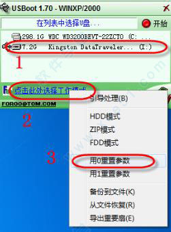 a、双击运行此工具,在其界面中,选择不能格式化的U盘。点击选择工作模式,选择用0重置参数。