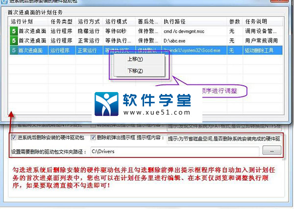 2、进入系统后删除安装的硬件驱动包:自定义被删除的驱动目录,是否弹出提示框及提示框提示内容,此项目带倒计时不删除处理的功能,倒计时间为1分钟,当一分钟无人值守则自动退出,这个执行已加入到任务计划里,可以自由编辑,对于驱动目录可以采用系统环境变量或SC提供的变量的方式书写,如:C:\Drivers可写成%SystemDrive%\Drivers。
