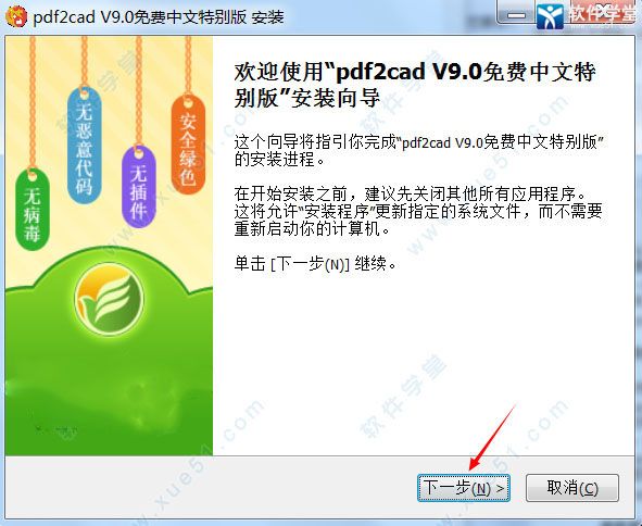 1、在本站下载好安装包,双击运行“pdftwocad.exe”程序,弹出软件安装向导,点击“下一步”开始安装;