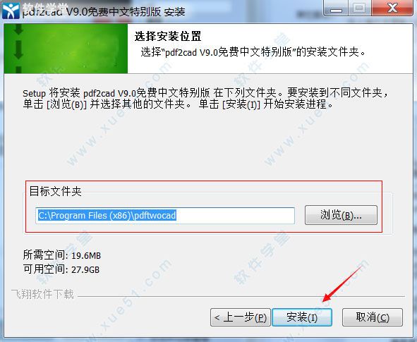 2、自定义选择软件安装位置,默认安装路径为“C:Program Files (x86)pdftwocad”,安装路径在选择时不要选择带有中文符号的路径,点击“安装”按钮进行安装;