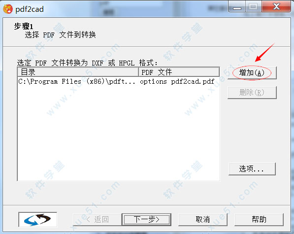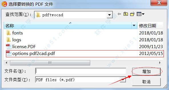 1、安装完成后运行软件,在弹出的文件选择窗口中选择需要进行文件转换的pdf文件,点击“增加”按钮完成文件的导入操作;