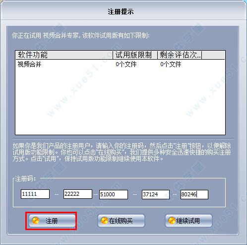 1、解压下载文件夹,双击运行“视频合并专家 .exe”应用程序,打开软件,此时为试用版的,单击注册,