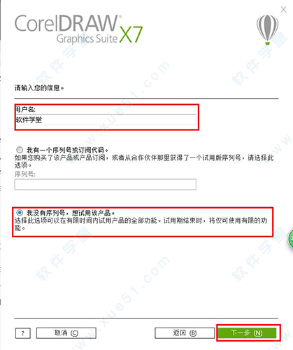 5、输入用户名,勾选“我没序列号想试用该产品”,点击“下一步”。