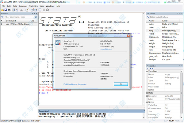 由于软件为绿色版程序,所以软件已提前集成了软件绿化文件,同时在绿化文件的基础上进行了软件的注册激活,用户无需再次进行软件的注册激活便可以轻松运行使用,免除用户在安装和激活过程中的困扰,如果您有软件序列号的需求,我们也提供Stata 14 永久序列号供您自行激活使用: