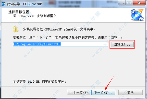 3、自定义软件安装位置,默认安装路径为“C:Program FilesCDBurnerXP”,安装路径选择时不要选择带有中文符号额路径,点击“下一步”继续安装;