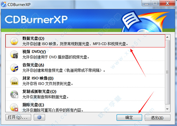 2、在软件主界面上点击“数据光盘”选项进行光盘数据刻录,单击“确定”按钮;