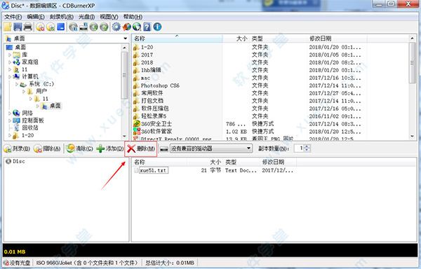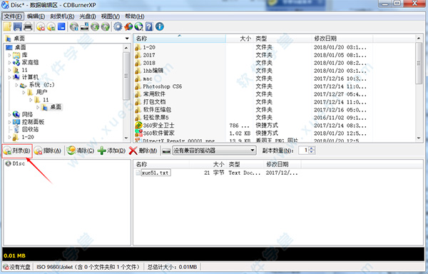 3、弹出“Disc 数据编辑区”窗口,选择需要使用的刻录机;
