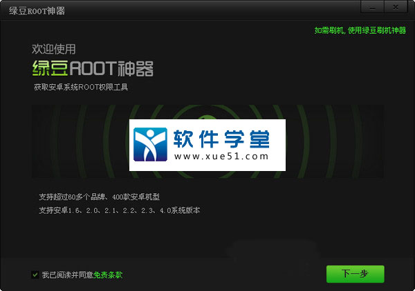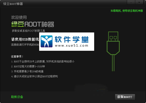 绿豆ROOT神器是一款非常不错的安卓自动刷机神器,它化繁为简,为用户提供了一键刷机功能,能够让广大的安卓手机用户都能随时随地享受刷机的快乐。该软件支持安卓1.6 、2.0 、2.1 、2.2 、2.3 、4.0 系统版本,几乎支持任何安卓手机获取root权限,除了提供一键刷机外,还提供了海量的安卓手机软件和游戏下载,原生ROM、第三方ROM下载。另外软件还能够自动安装手机驱动,使用的时候用usb数据线连接手机与电脑,同时打开手机的usb调试模式,用户在使用时只要接入手机,点击一键root等待结束就可以了,这样手机经过root之后,大家就可以更好地管理手机了。比起其它root工具来说,使用绿豆ROOT神器电脑版不会对手机的数据造成损害,你不需要对手机进行备份就可以完成所有操作。